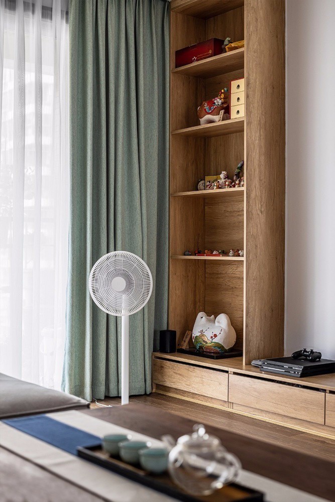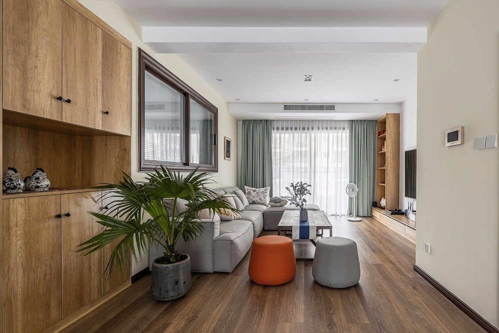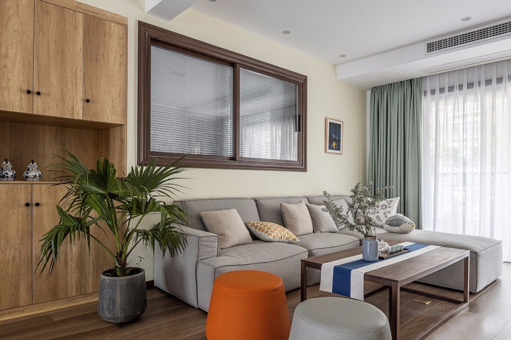 客廳利用半墻加窗戶的形式與書房連接,并在沙發(fā)背景墻左側利用書房空間做成了儲物柜,將行李箱安置地妥妥的,中部留空的設計便于小物件的取放。