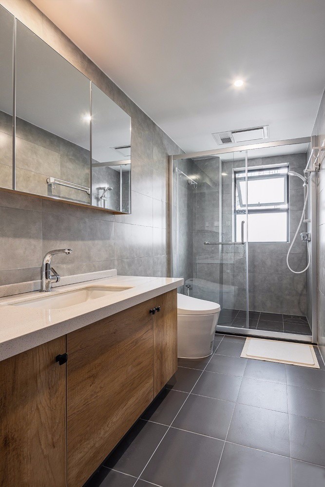 打通次衛(wèi)干濕分區(qū)的一堵墻,采用玻璃隔斷的設計,既不怎么占用空間,視覺上也變得很寬敞。超大的浴室柜真的很實用,大面積的鏡柜方便收納各種瓶瓶罐罐。:
