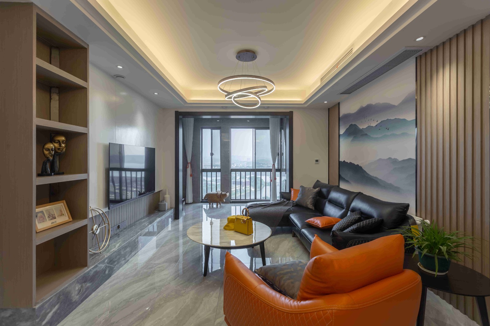 橙色單人皮質(zhì)沙發(fā),造型獨特的工藝吊燈,電視墻左側(cè)佇立的木柜,都為客廳的灰藍白色調(diào)增添了色彩。