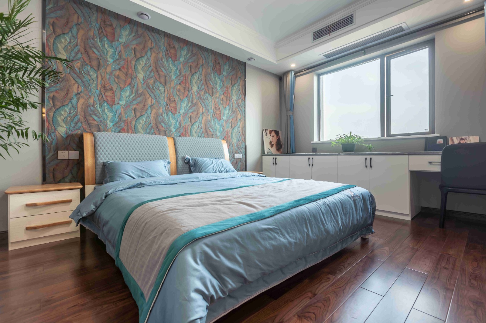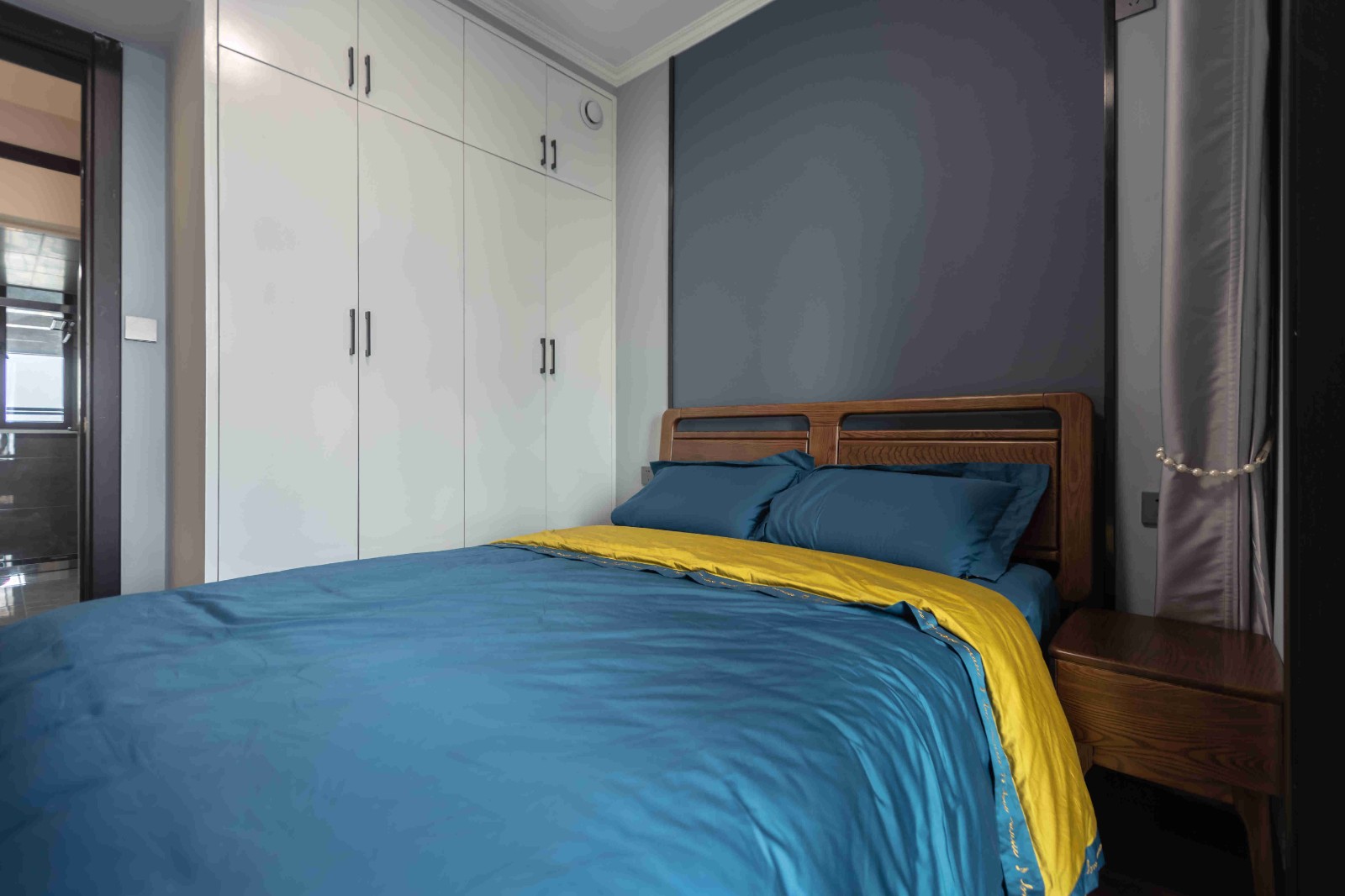 在原戶型的基礎(chǔ)上,并沒有做太多的改動??看霸黾恿艘慌哦ㄖ乒褡樱饶茏鍪釆y臺又能放置東西。最引人注目的是床頭背景墻,充滿了藝術(shù)氣息,深邃幽遠。