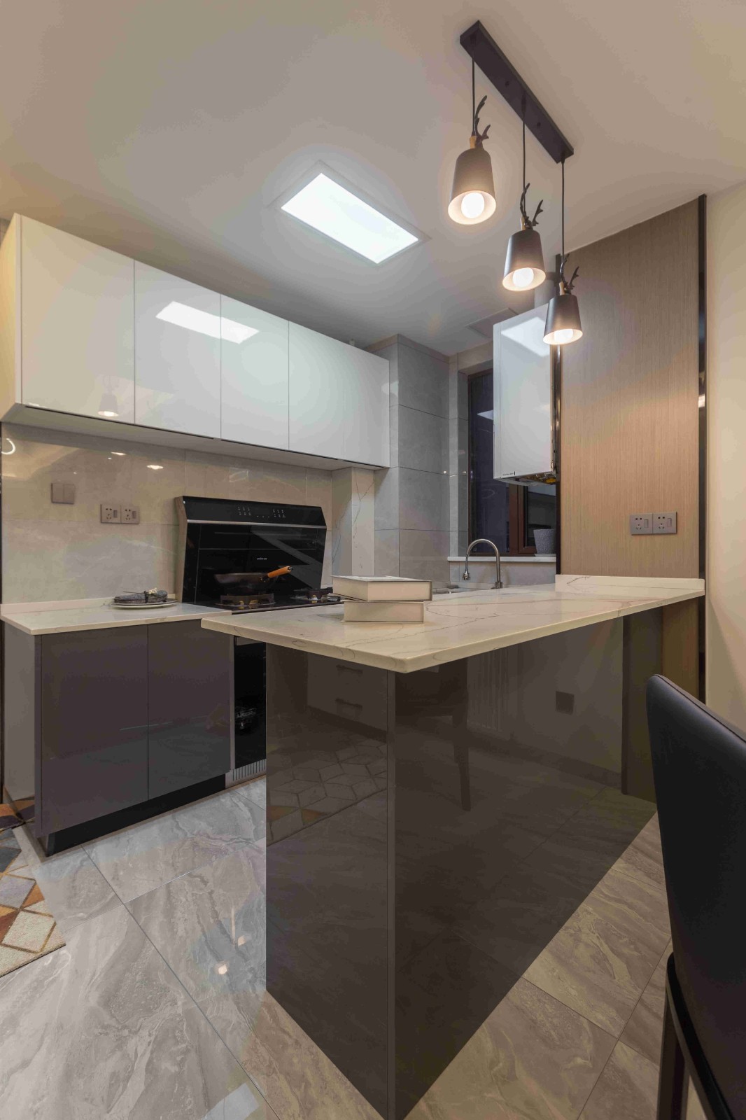 原戶型里,廚房不大,加上業(yè)主的喜好,因此考慮敞開式吧臺結(jié)合中式大圓桌,加上多個收納柜,滿足了女主人的需求。