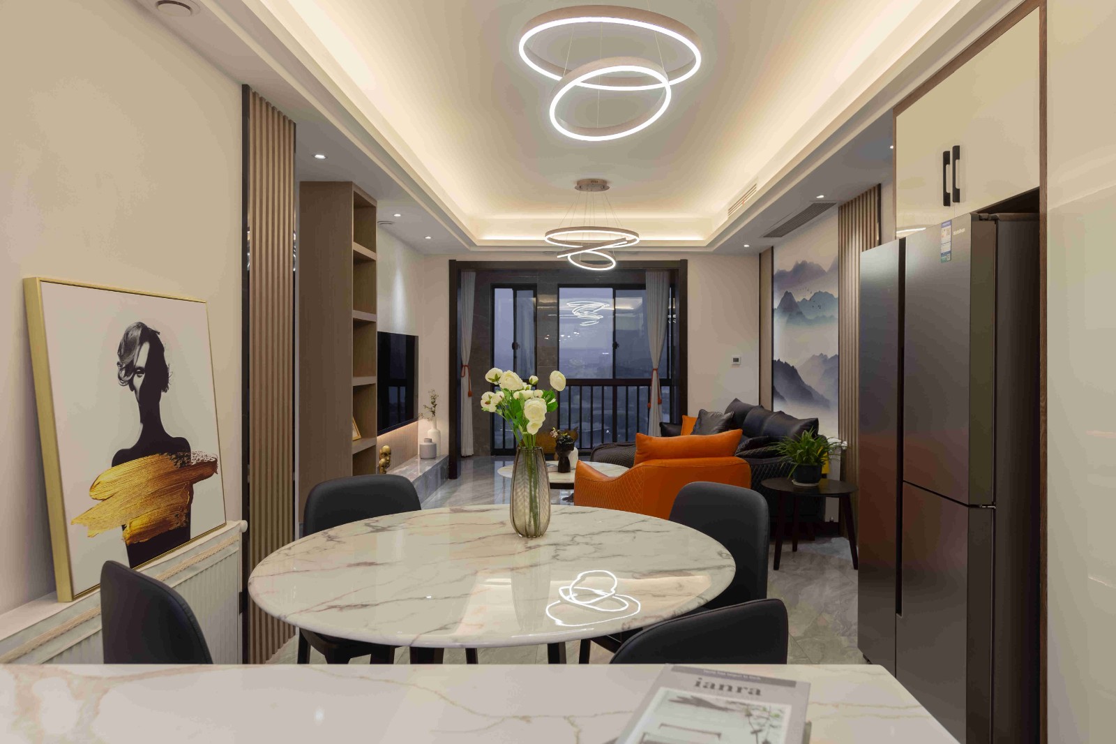 冰箱嵌入餐邊柜之中,大理石圓桌搭配四把皮質(zhì)餐椅,靠墻倚立的藝術(shù)照,客廳同款的工藝吊燈,低調(diào)奢華。