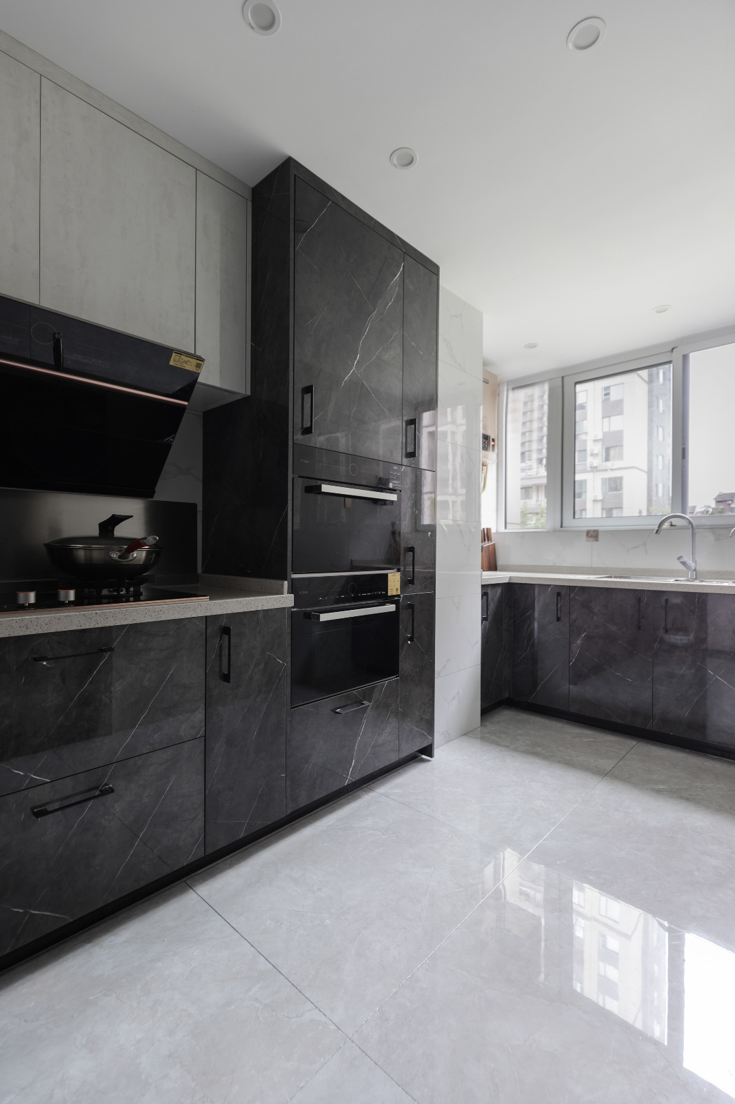 L型開放式廚房設(shè)計(jì),充分利用轉(zhuǎn)角空間,合理布局。白色吊柜柜門+墻磚,搭配木紋櫥柜,色彩清爽簡(jiǎn)約。