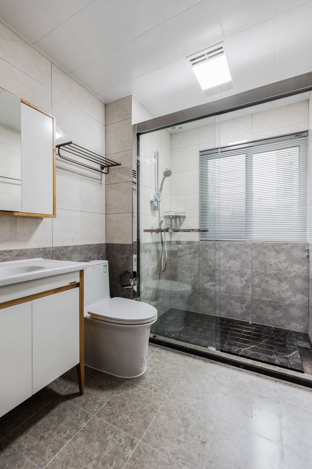 衛(wèi)生間簡(jiǎn)約黑白灰掉,白色+灰色墻面腰線設(shè)計(jì),深色簡(jiǎn)約臺(tái)盆柜加深了空間層次感。