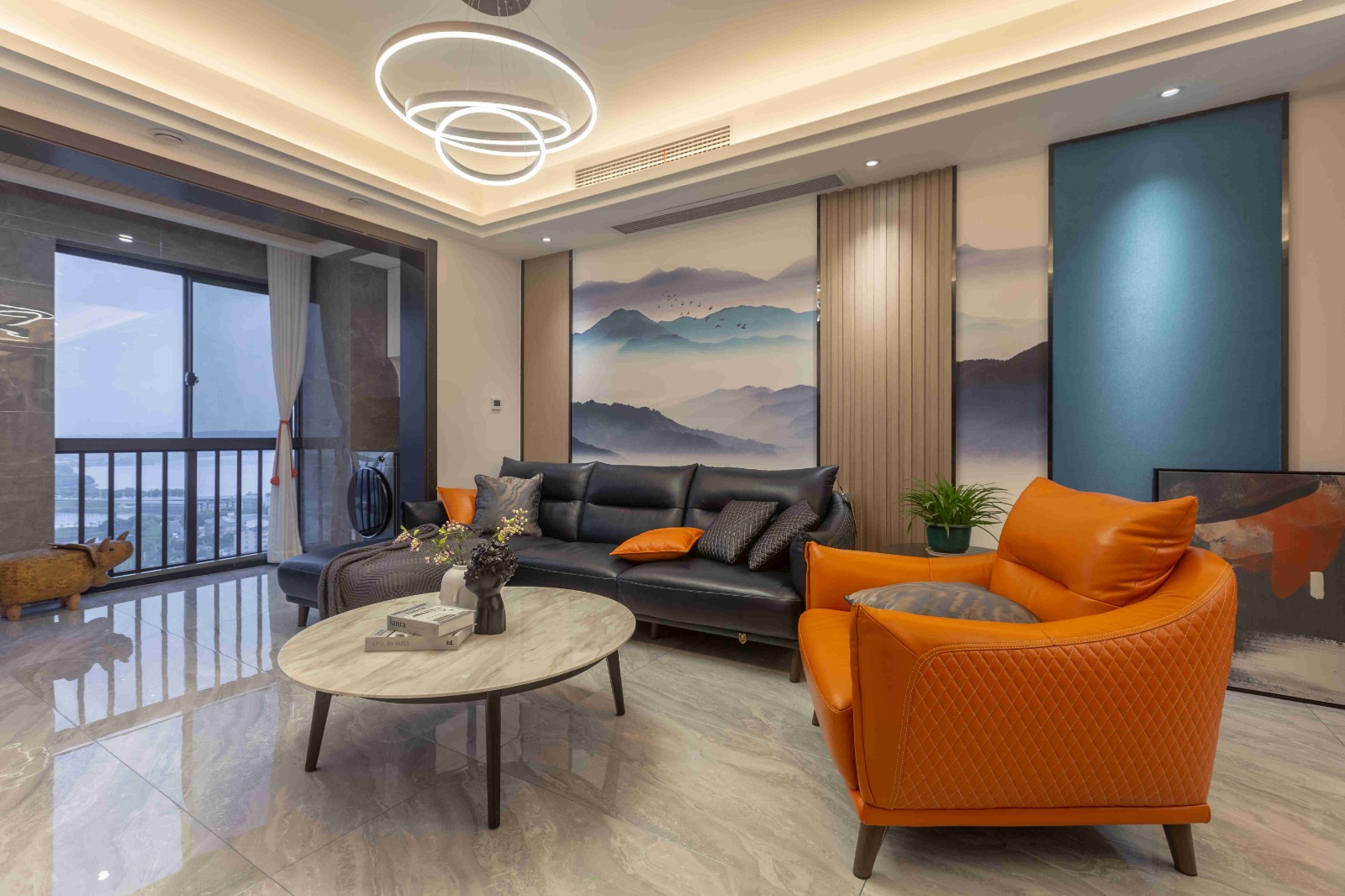 橙色單人皮質(zhì)沙發(fā),造型獨特的工藝吊燈,電視墻左側(cè)佇立的木柜,都為客廳的灰藍白色調(diào)增添了色彩。