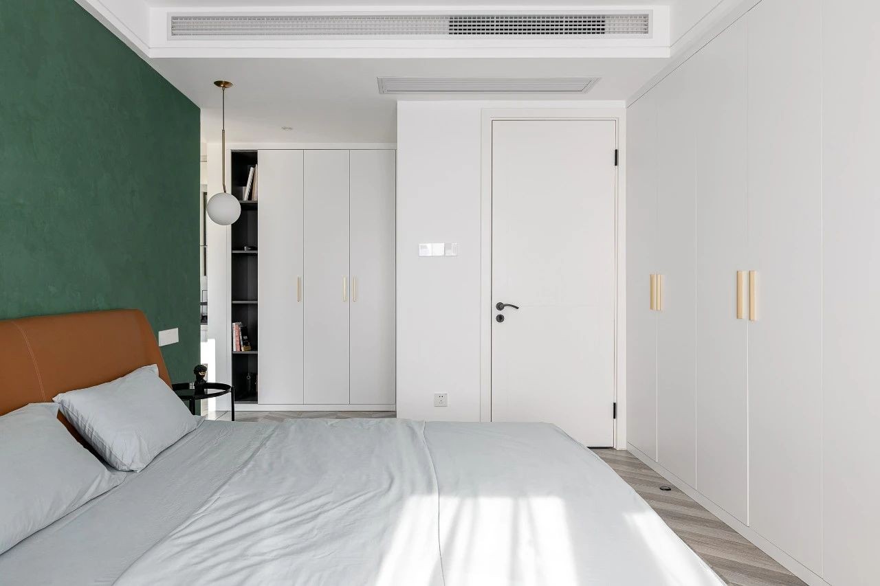 主臥的設(shè)計也延用了公共空間的配色,墨綠色作為床頭背景色,搭配黃色的皮革床,營造出低調(diào)高雅的氣質(zhì)。