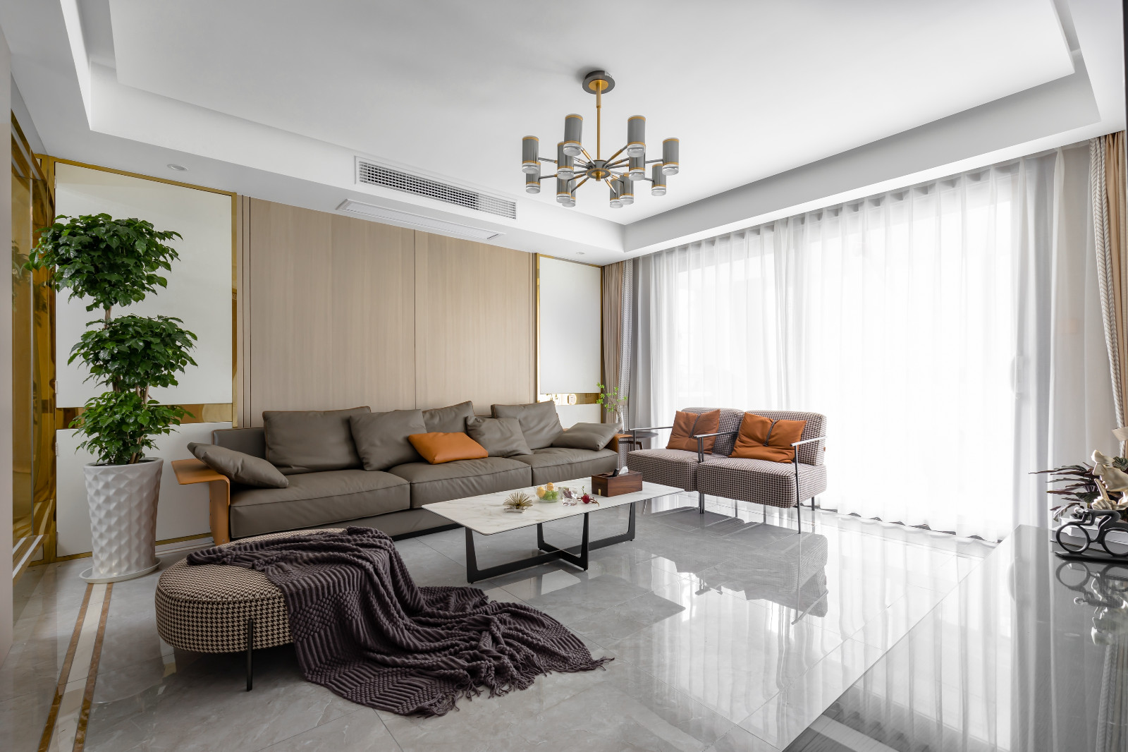客廳戶型方正,整面木飾面板裝飾沙發(fā)背景墻,原木家具搭配米色布藝沙發(fā),文藝淡雅。