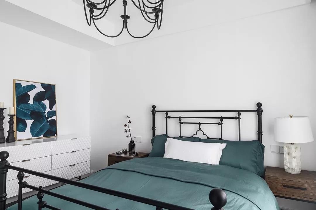 電視墻的設(shè)計也很有特色,在偏左的地方掛上一塊黑白相隔的毯子,在深灰色的電視墻上做了一個視覺沖擊的一個設(shè)計,讓電視墻看起來不單調(diào),有個性。